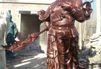 這款手工鑄銅噴金雕刻武財神關公雕塑,是一件精美的藝術品,它由熟練的工匠精心打造而成,他們用銅材料將關公的形象雕刻而成,把關公的外表描繪得栩栩如生,關公的臉頰上掛滿著笑容,微笑著看著世界,仿佛帶著一股溫情;它的身體肌肉線條分明,手臂和腿的位置相當準確,表現出他強壯的身體;它的頭發上有一朵花,猶如自然綻放,顯示出關公的英氣;它的衣服精致華麗,用噴金手工繪制,表現出關公的身份地位;它的背景有著武器和財富,表明關公身為武財神,象征著關公的力量和權威。